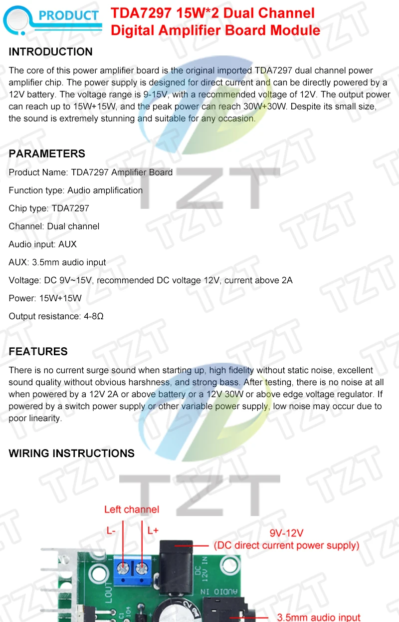 TZT TDA7297 amplifier board digital amplifier board dual-channel amplifier board finished no noise 12V dual 15W (A type)
