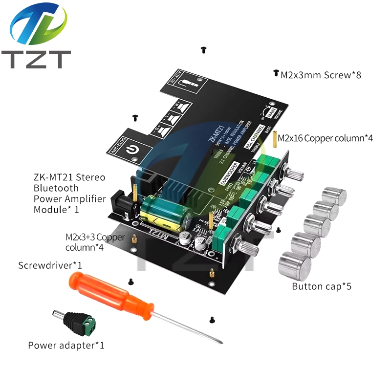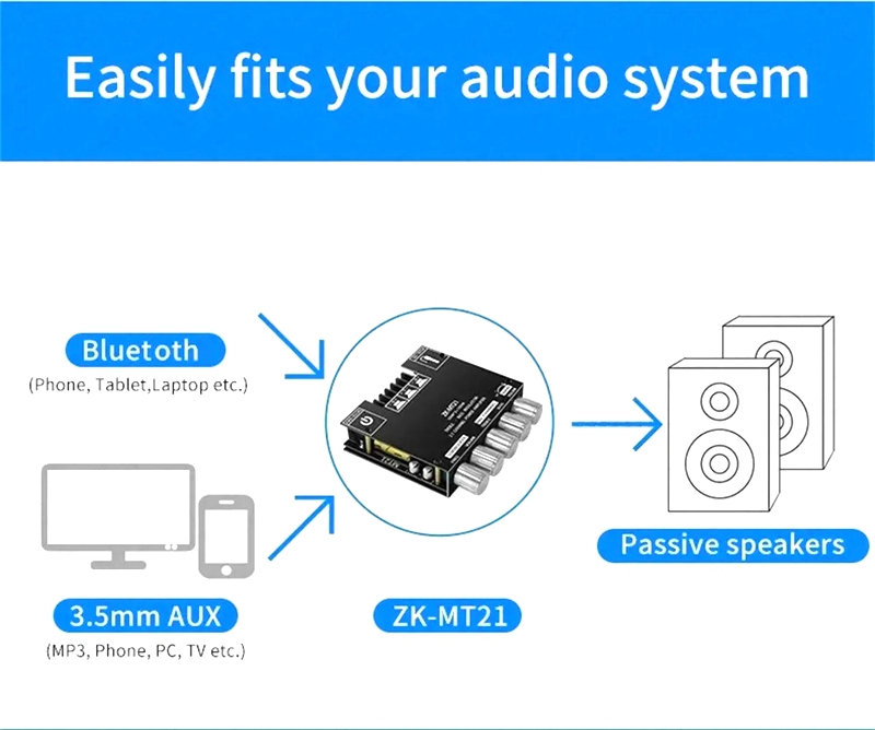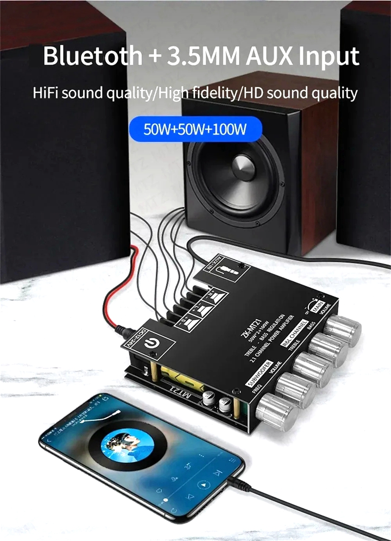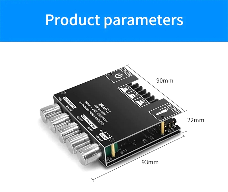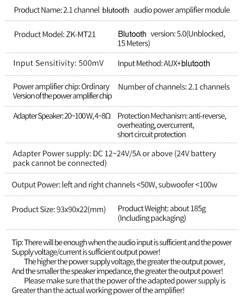 It is recommended to use a 18V19V24V power supply with a current of more than 3A. If you only have a 9V12V or 1A 2A power supply, you can also use it, but the power is small. Please note that when using it, turning the volume to the maximum may cause